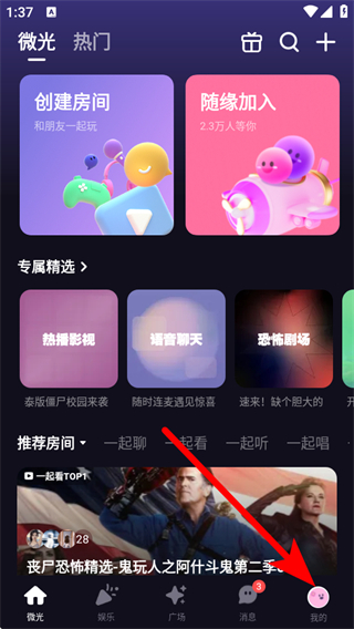 1.首先我們?cè)诒菊鞠螺d安裝好微光APP后,登陸賬號(hào)進(jìn)入軟件,可以看見(jiàn)頁(yè)面有1V1房、多人房,顧名思義1V1就是兩個(gè)人單獨(dú)一起看劇交流,多人就是兩人以上一起交流聊天;