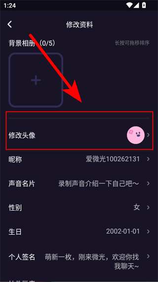 3、在修改資料頁(yè)面,點(diǎn)擊修改頭像選項(xiàng),彈出頭像上傳菜單。