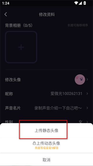 4、在菜單中選擇上傳靜態(tài)頭像,從手機(jī)相冊(cè)中選擇新的頭像圖片,完成上傳后即可更換頭像圖片。