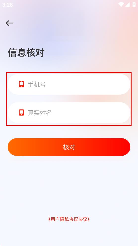 3、在信息核對頁面,分別在“手機(jī)號”和“真實姓名”欄中輸入自己的手機(jī)號和真實姓名。