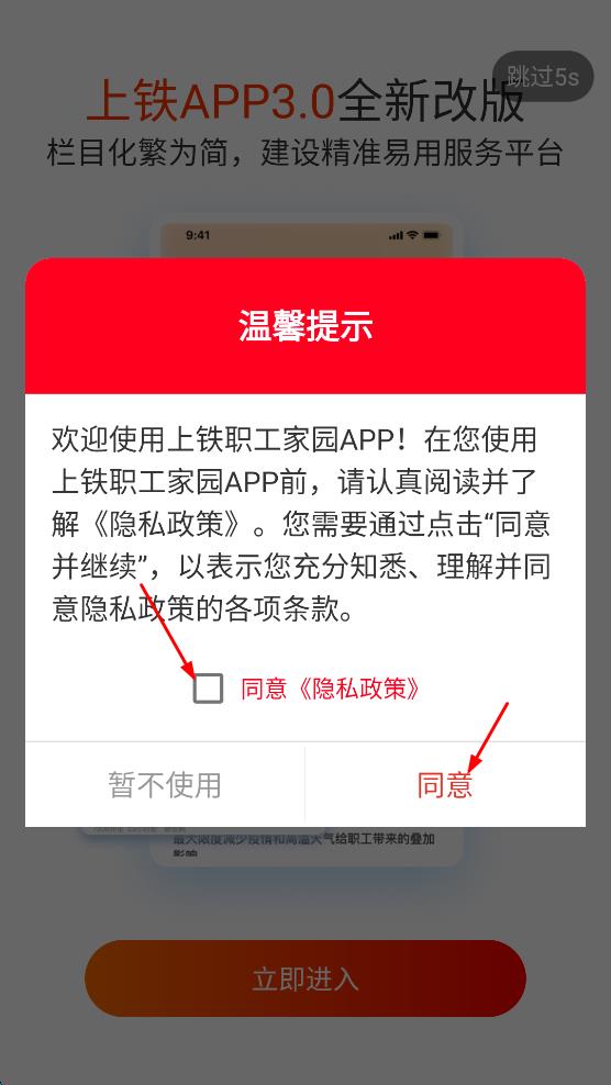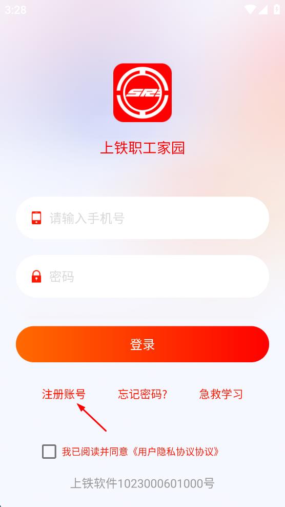 1、打開上鐵職工家園APP,在彈出的“溫馨提示”框中,勾選同意隱私政策,然后點擊“同意”按鈕,進(jìn)入登錄頁面。