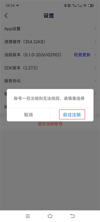 4、接下來(lái)就會(huì)彈出一個(gè)讓你確認(rèn)賬號(hào)注銷(xiāo)的彈窗,繼續(xù)點(diǎn)擊【前往注銷(xiāo)】進(jìn)行注銷(xiāo)的確認(rèn),一旦賬號(hào)的注銷(xiāo)這個(gè)應(yīng)用中的所有資源全部都會(huì)被消除掉。