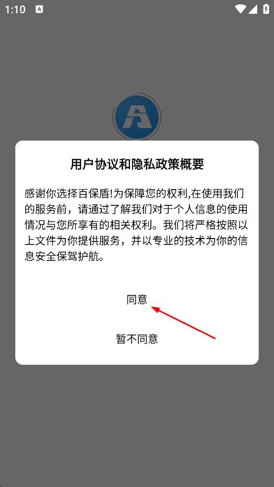 1、打開(kāi)百保盾app,在彈出的用戶(hù)協(xié)議和隱私政策概要界面,找到“同意”按鈕,點(diǎn)擊該按鈕。