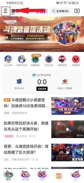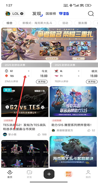 4、授權(quán)登錄完成后,進(jìn)入掌上英雄聯(lián)盟的發(fā)現(xiàn)頁(yè)面,可以點(diǎn)擊賽事進(jìn)入查看相關(guān)信息。