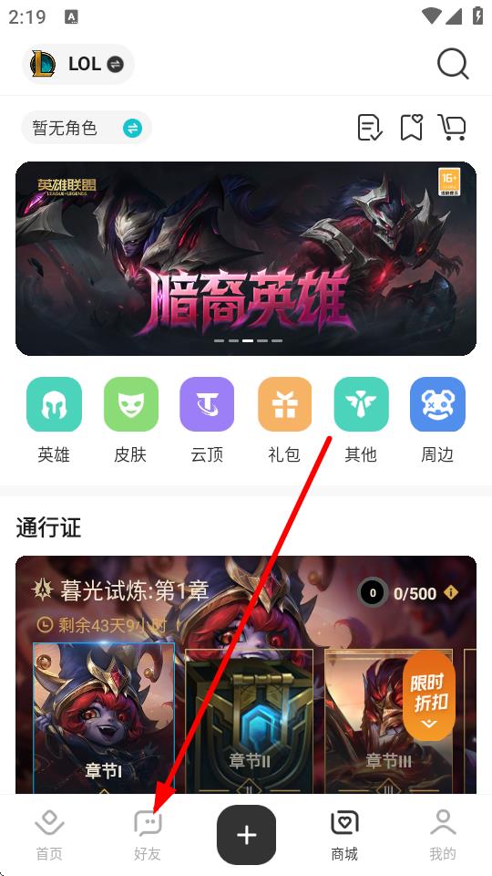 1、打開(kāi)掌上英雄聯(lián)盟APP,點(diǎn)擊底部導(dǎo)航欄中的好友選項(xiàng)。