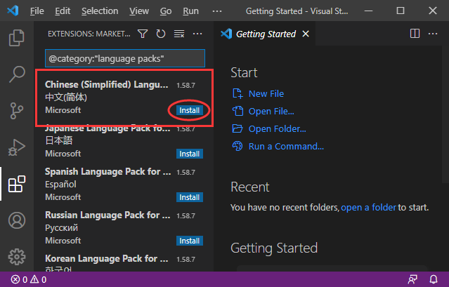 等待一會(huì)就安裝成功了,右下角會(huì)有“Would you like to change VS Code’s UI language to Chinese Simplified and restart?”的提示,詢問(wèn)你是否切換成中文,選擇下面的“Change Language and Restart”