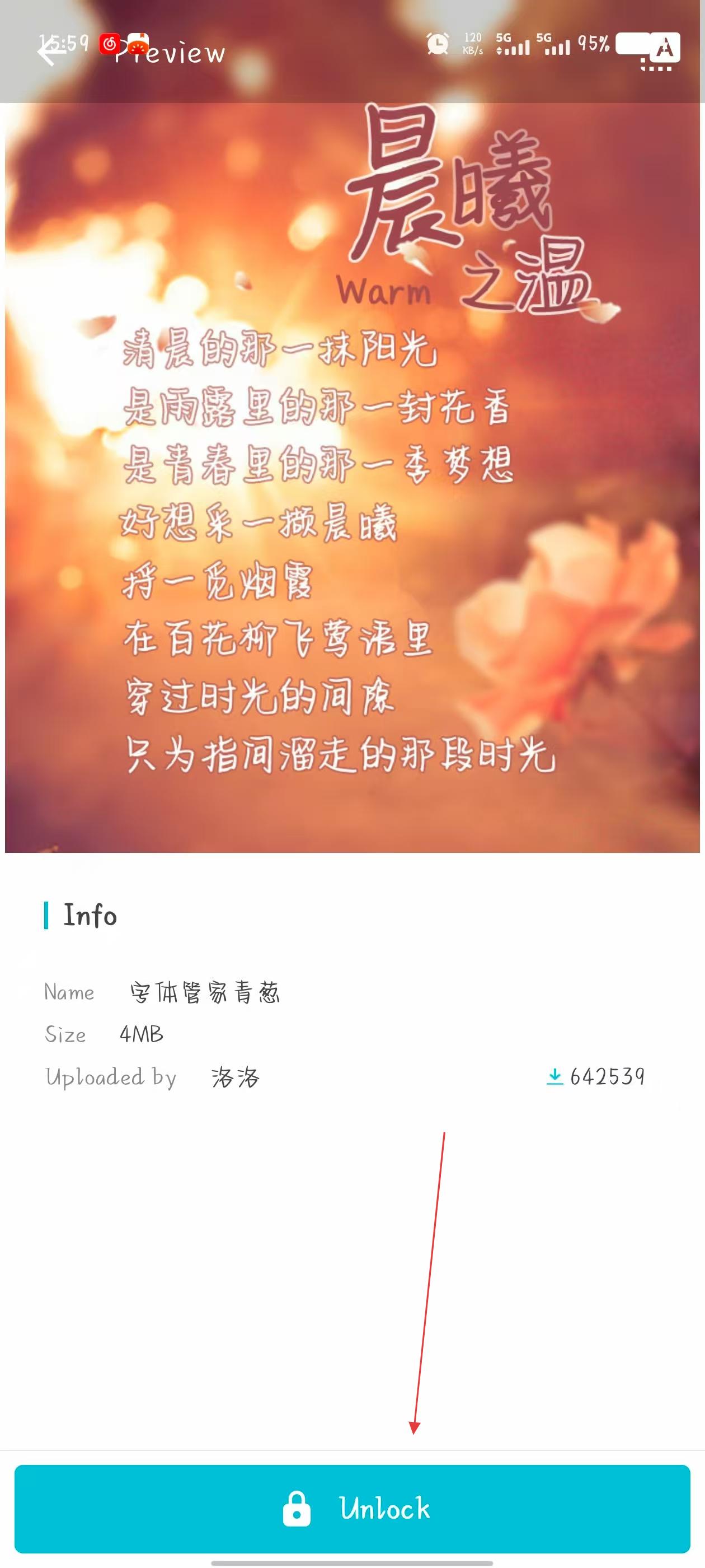 2、在字體預(yù)覽界面,點(diǎn)擊下方標(biāo)有Unlock的按鈕,解鎖該字體。