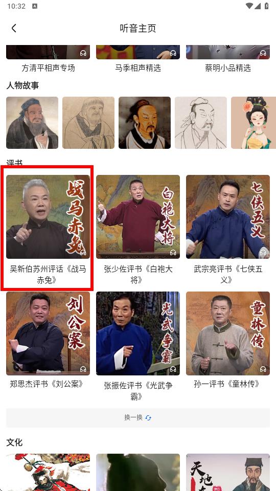 2、在聽音主頁找到想聽的節(jié)目,如吳新伯蘇州評話戰(zhàn)馬赤兔。