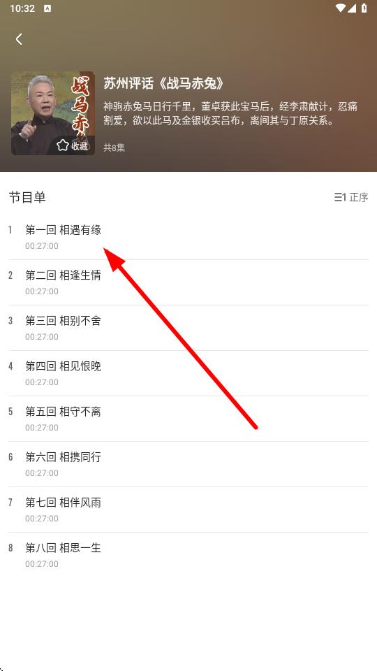 3、點擊該節(jié)目進入播放頁面,下方節(jié)目單區(qū)域就能看到目錄內容,點擊對應目錄可收聽。