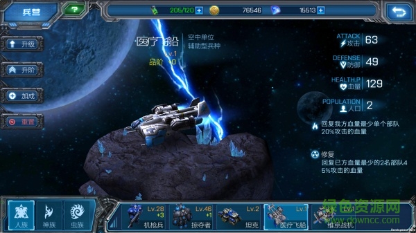 醫(yī)療飛船:是人族特有的治療單位,由于是空中單位,平時還能充當(dāng)空中肉盾作用。