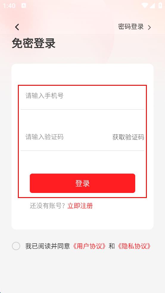 4、在免密登錄界面輸入手機(jī)號,點(diǎn)擊獲取驗(yàn)證碼,輸入驗(yàn)證碼,勾選已閱讀并同意相關(guān)協(xié)議后點(diǎn)擊登錄,完成登錄操作。