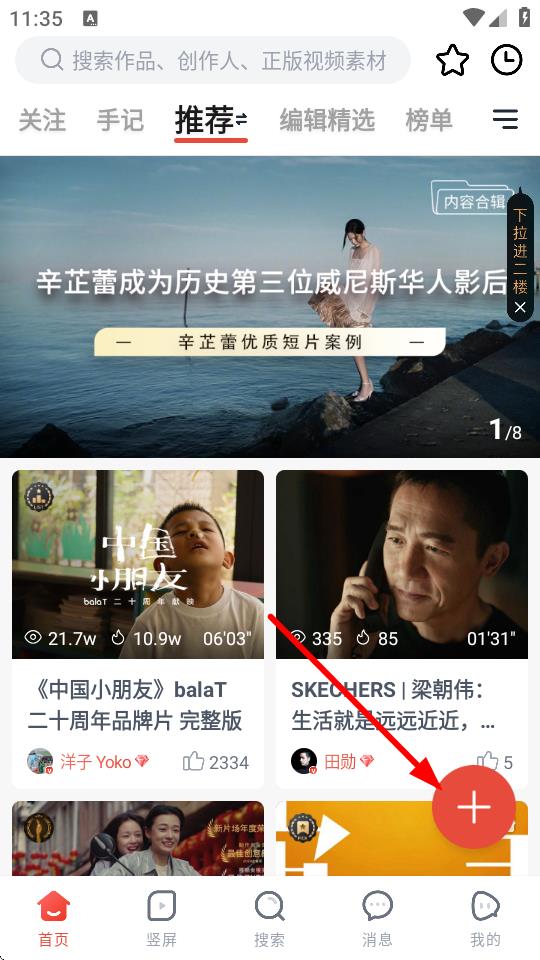 1、打開新片場應(yīng)用,進入首頁。在首頁界面下方,點擊正中間的加號圖標(biāo)。