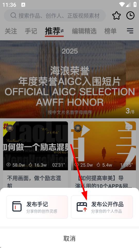 3、在彈出的發(fā)布選項菜單中,點擊發(fā)布公開作品選項。