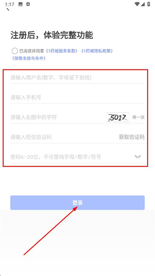 4、輸入用戶名、手機(jī)號(hào)等信息,勾選服務(wù)條款,點(diǎn)擊登錄按鈕。
