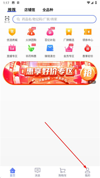 1、打開(kāi)1藥城app,點(diǎn)擊底部導(dǎo)航欄中的我的選項(xiàng)。