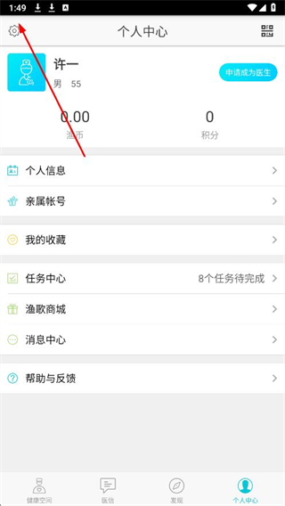 2、在個人中心頁面,點擊左上角的設置圖標。