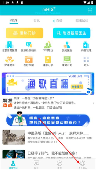 1、打開漁歌醫(yī)療APP,點擊導航欄中的個人中心。