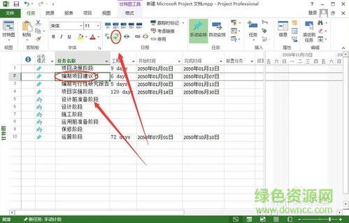 5、有些任務(wù)是某個階段下的子任務(wù),需要要project調(diào)整一下級別,即階級,選擇要階級的任務(wù),如編制項(xiàng)目建議書,然后點(diǎn)擊任務(wù)功能區(qū)中的降級任務(wù)按鈕;