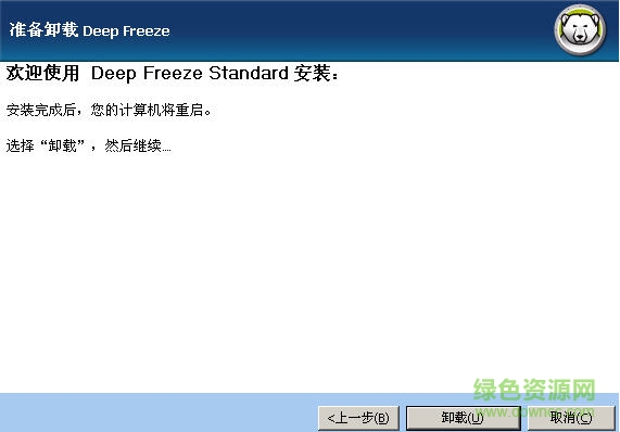 3. 確定冰點(diǎn)還原禁用后,運(yùn)行冰點(diǎn)還原的安裝程序,這時(shí)安裝程序就會(huì)自動(dòng)檢測(cè)電腦里是否安裝冰點(diǎn)還原,并給出卸載向?qū)Ы缑妗?/p>