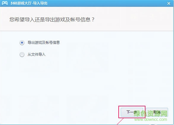 2.打開360游戲大廳導(dǎo)入導(dǎo)出界面,點(diǎn)擊【導(dǎo)出游戲及賬號(hào)信息】選項(xiàng),然后點(diǎn)擊【下一步】,選擇您要備份的保存位置就可以了。