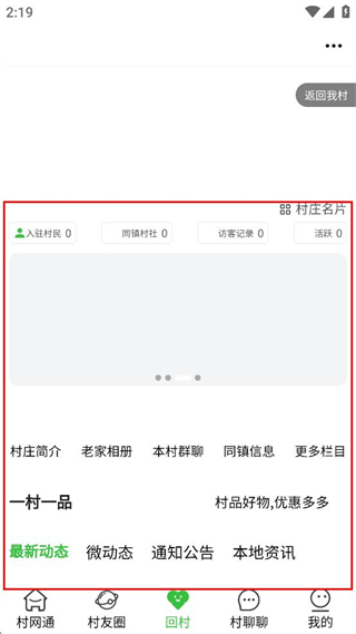 4、登錄后點擊回村,即可查看村莊的入駐村民、同鎮(zhèn)村社等信息及村莊簡介、老家相冊等欄目。