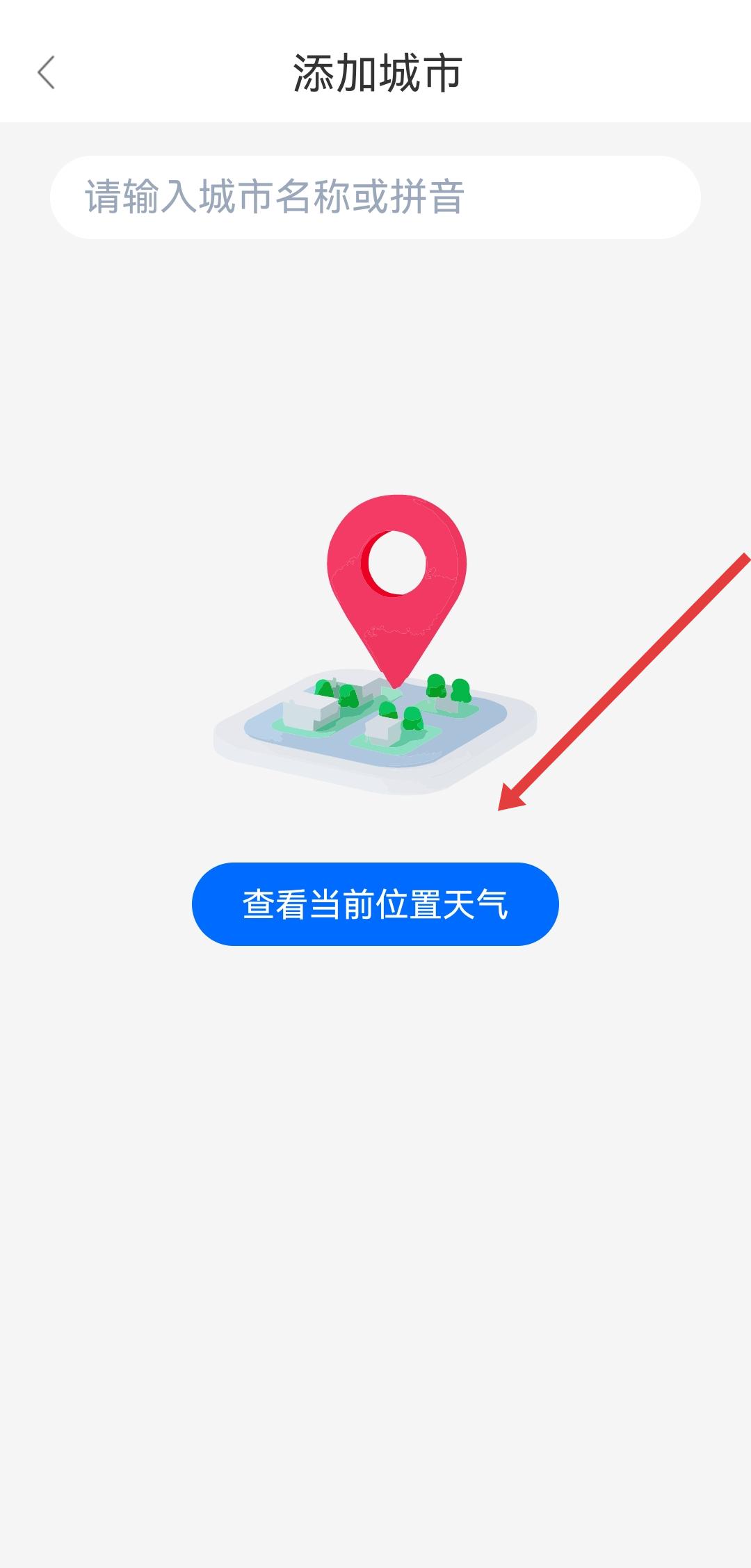 1、下載好360天氣預(yù)報并打開,首頁會彈出添加城市頁面,點擊查看當(dāng)前位置天氣按鈕,觸發(fā)定位功能。