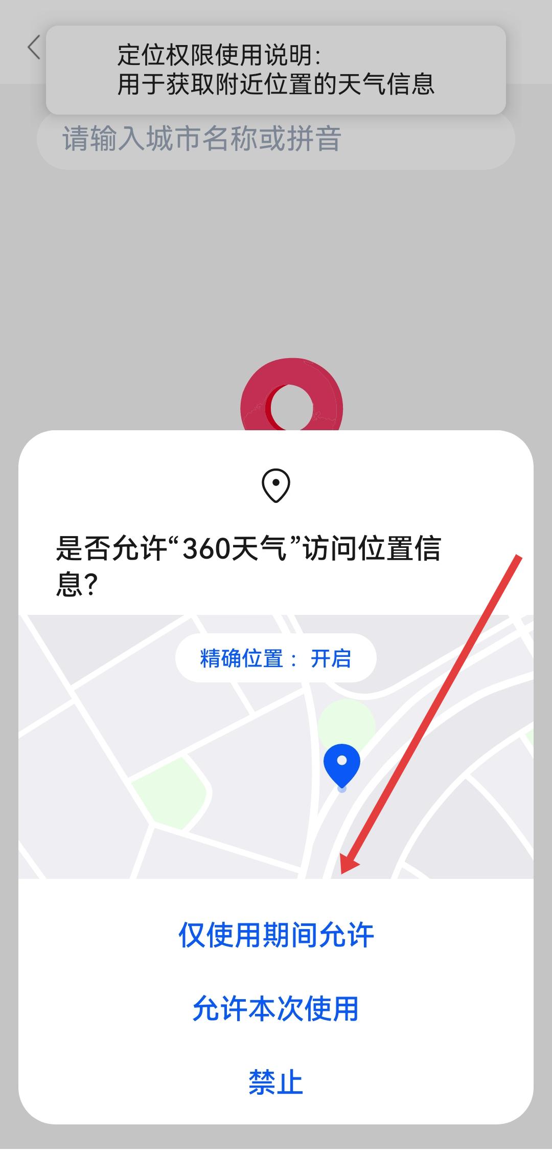2、在彈出的位置權(quán)限請求框中,選擇僅使用期間允許選項,授予應(yīng)用精準(zhǔn)定位權(quán)限。