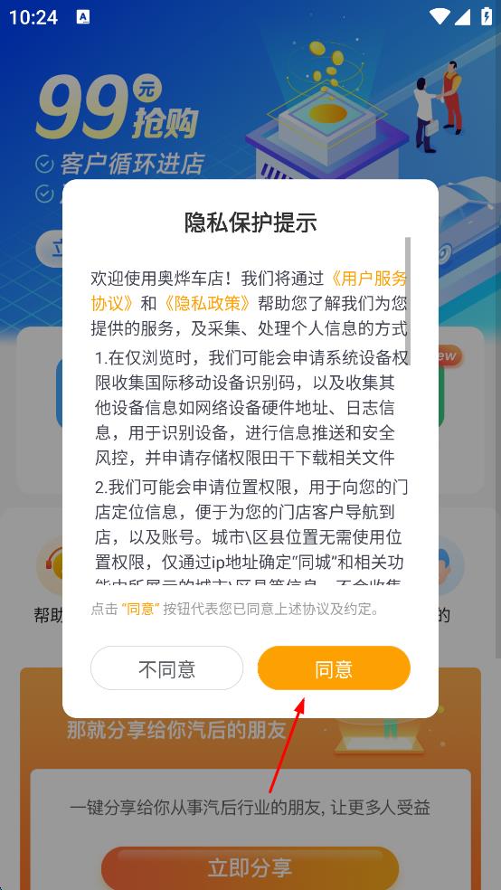 1、打開奧燁車店APP,在彈出的隱私保護提示頁面,仔細閱讀相關內容后,點擊“同意”按鈕。
