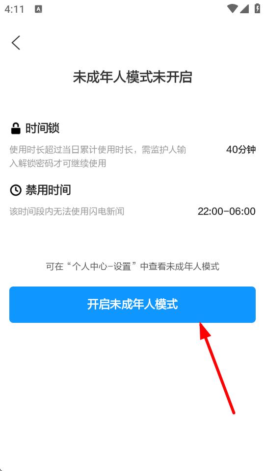 4、進入未成年人模式頁面后,點擊開啟未成年人模式按鈕,根據(jù)提示完成設(shè)置,即可開啟青少年模式。