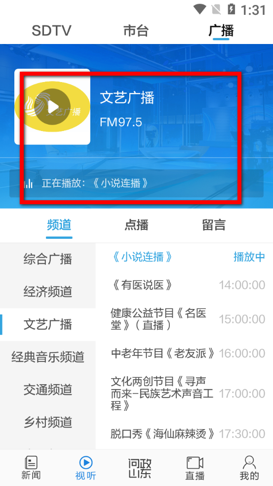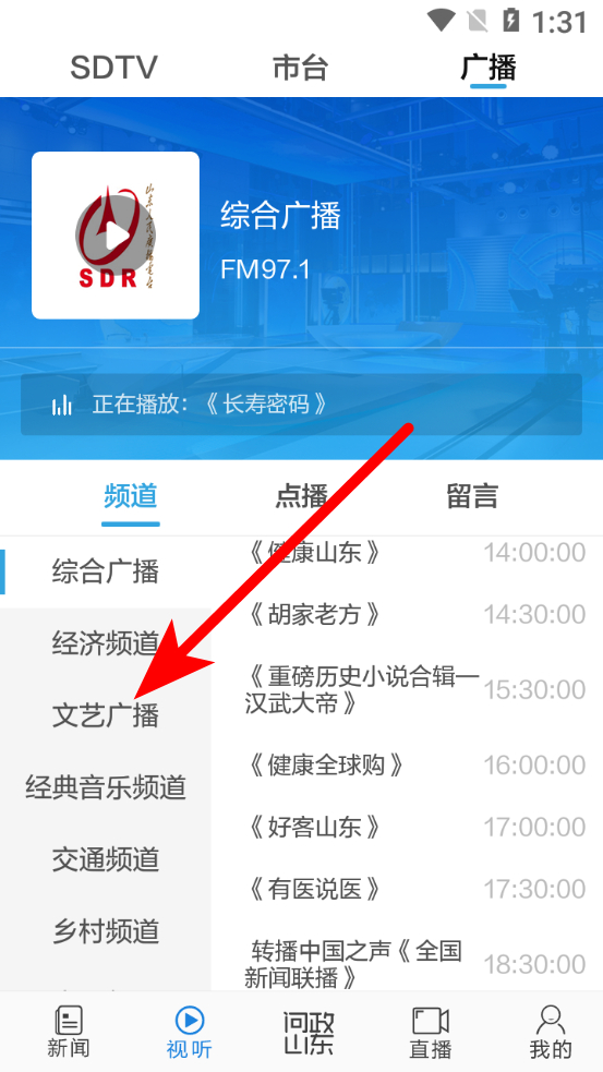 3、在廣播頻道選擇頁面,點擊想要收聽的廣播頻道,如文藝廣播。