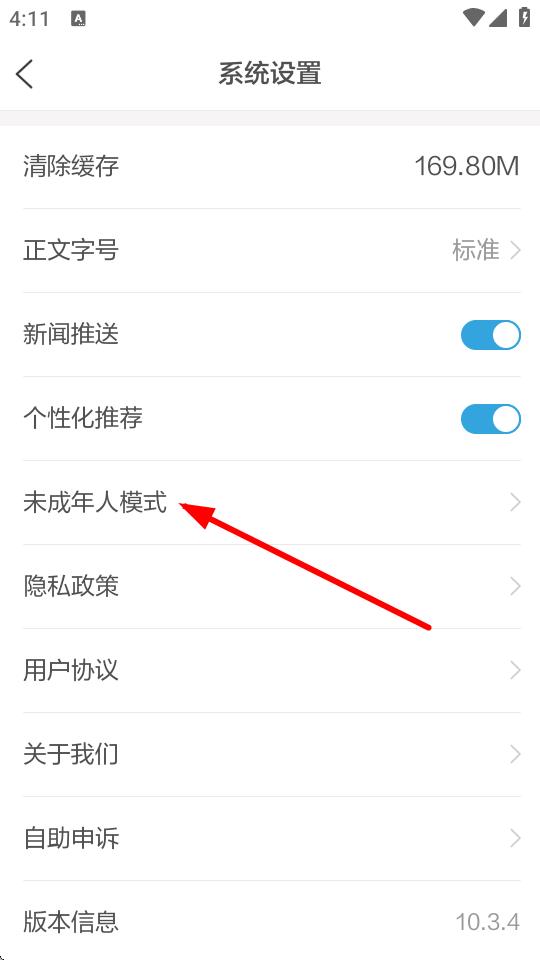 3、在系統(tǒng)設置界面里,點擊未成年人模式選項。