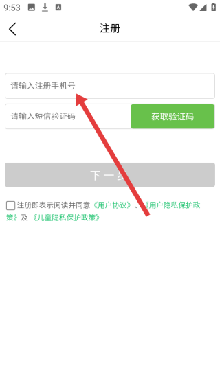 3、在進(jìn)入到注冊(cè)頁(yè)面后,點(diǎn)擊輸入框填寫手機(jī)號(hào),獲取驗(yàn)證碼后完成注冊(cè)操作。