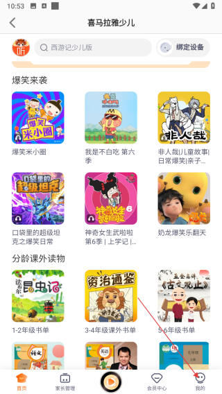1、打開智天使APP,進(jìn)入喜馬拉雅少兒功能界面,點(diǎn)擊底部導(dǎo)航欄右側(cè)的我的選項(xiàng),切換至個(gè)人中心頁面。