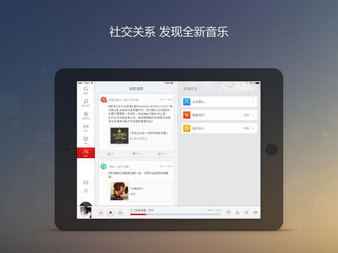 網(wǎng)易云音樂ipad版是網(wǎng)易公司專為ipad用戶打造的云音樂播放器,超高品質音樂資源,最新歌曲免費收聽,還可以將ipad中音樂同步到手機、電腦等設備。趕快下載體驗吧!