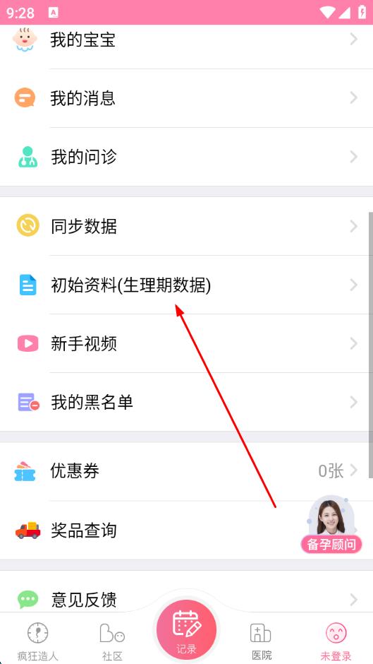2、在“未登錄”頁(yè)面里,找到并點(diǎn)擊初始資料(生理期數(shù)據(jù))選項(xiàng)。