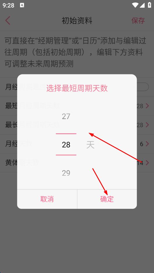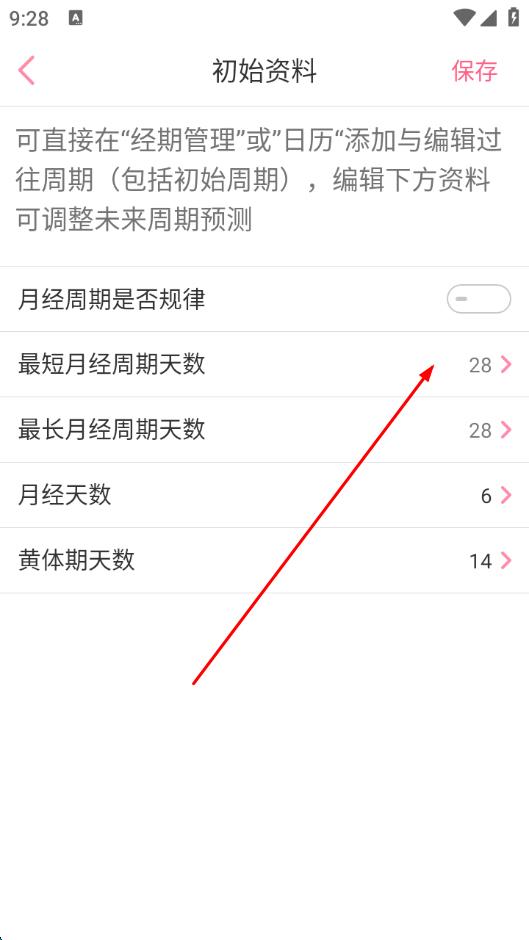 3、進(jìn)入初始資料頁(yè)面后,點(diǎn)擊最短月經(jīng)周期天數(shù)編輯項(xiàng)。