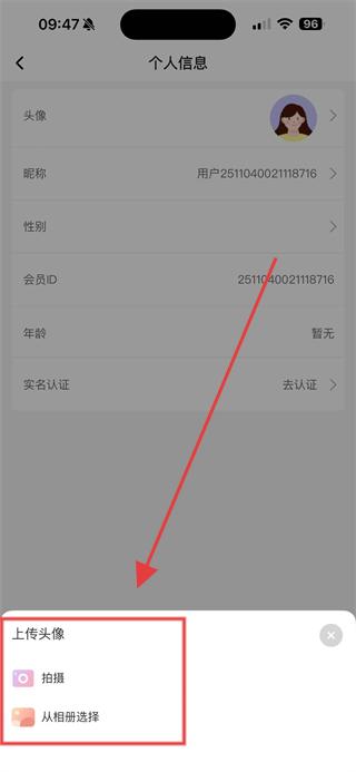 4、可選擇拍攝或從相冊選擇的方式,選擇新的頭像圖片并上傳,即可完成時代峰峻APP頭像圖片的更換。