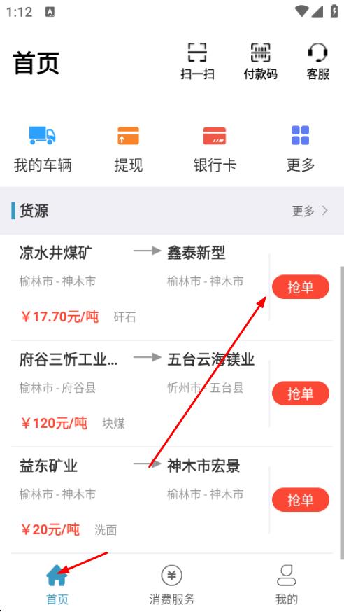 2、進(jìn)入APP首頁,在貨源板塊能看到不同線路的貨源信息,包括裝貨地、卸貨地、貨物類型及價格等,點擊搶單,司機(jī)可以爭取運輸業(yè)務(wù)。