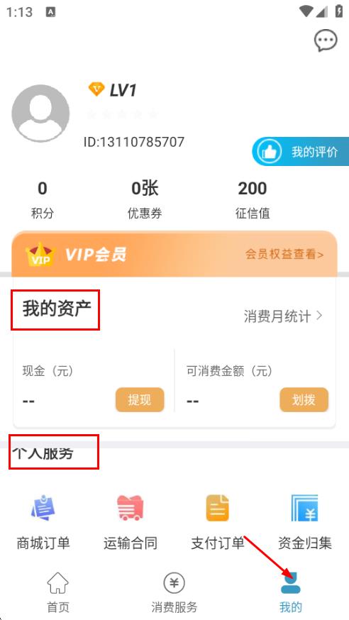 4、點擊我的,進(jìn)入個人頁面。我的資產(chǎn)可查看余額,進(jìn)行提現(xiàn)、劃撥操作;個人服務(wù)涵蓋商城訂單、運輸合同、支付訂單、資金歸集等管理功能。