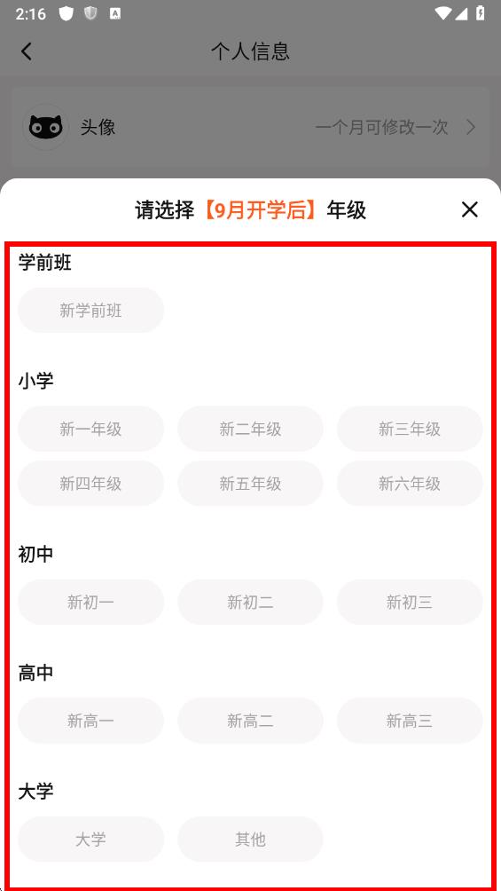 4、在彈出的年級選擇界面中,根據(jù)實際情況選擇對應(yīng)的年級選項,即可完成年級修改。