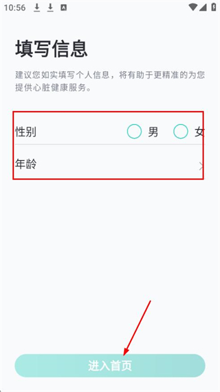 5、在填寫信息頁面,選擇性別并輸入年齡,點擊進(jìn)入首頁,完成注冊。