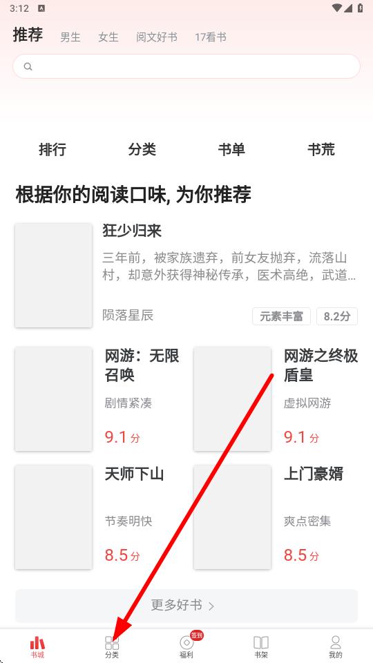 1、打開追書神器進(jìn)入書城頁(yè)面,點(diǎn)擊底部導(dǎo)航欄中的分類選項(xiàng)。