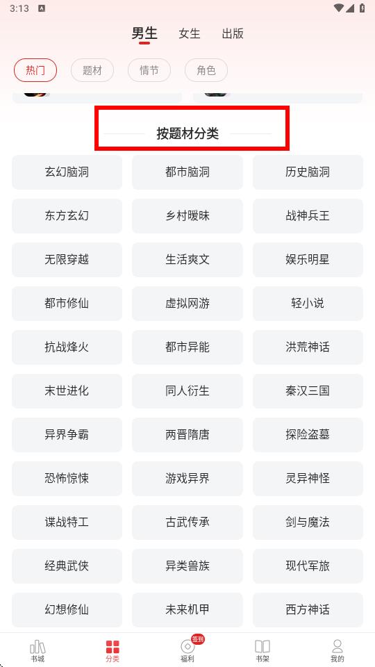 2、在分類頁(yè)面中,點(diǎn)擊按題材分類欄,此時(shí)會(huì)展示眾多題材選項(xiàng)。