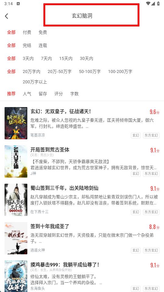 3、點(diǎn)擊感興趣的題材,比如玄幻腦洞,進(jìn)入該題材頁(yè)面后,即可瀏覽該題材下的各類書籍。