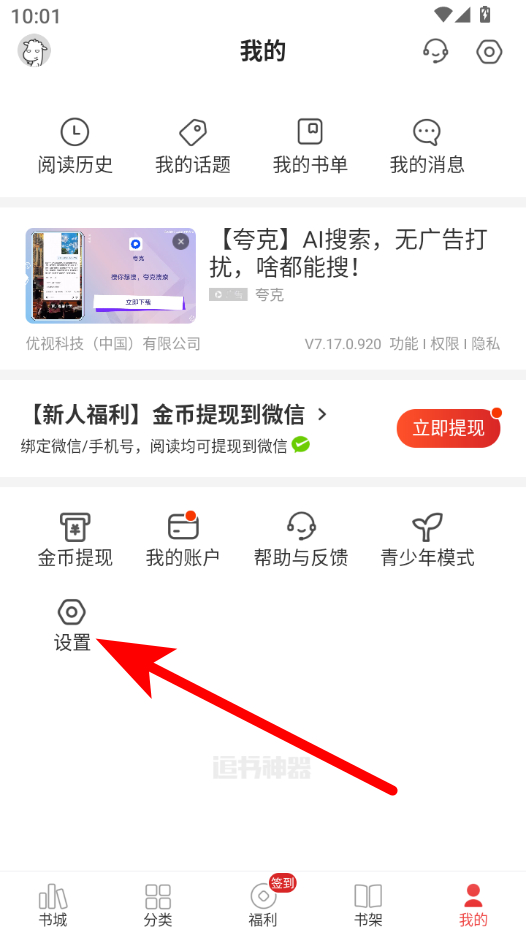 1、在追書神器書城頁(yè)面,點(diǎn)擊我的選項(xiàng),進(jìn)入個(gè)人中心頁(yè)面。