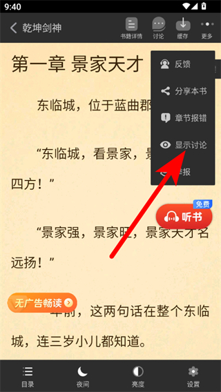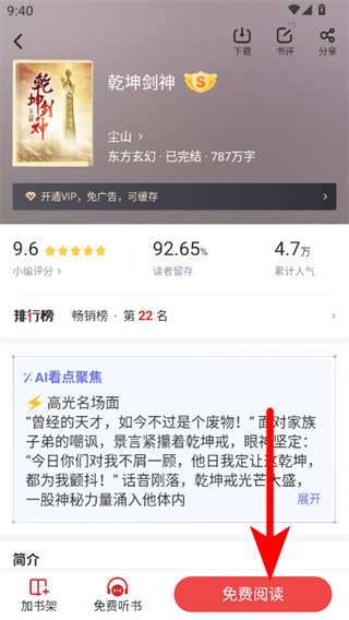 1、在追書神器書籍詳情頁(yè)面,點(diǎn)擊免費(fèi)閱讀按鈕,進(jìn)入書籍閱讀頁(yè)面。