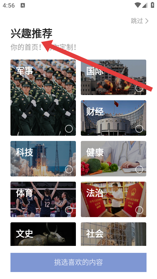 1、進入APP后,在興趣推薦頁面挑選軍事、國際等感興趣的內(nèi)容板塊,定制專屬首頁,獲取個性化資訊推送。