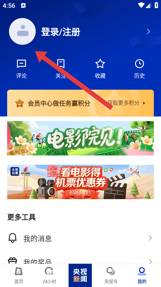 2、切換至我的頁面,點擊頂部登錄/注冊區(qū)域,進入賬號登錄或注冊流程,解鎖評論、收藏等功能。