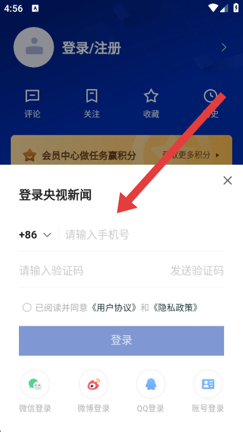 3、在登錄界面,輸入手機號與驗證碼或選擇微信、微博等方式,勾選協(xié)議后點擊登錄,完成央視新聞賬號登錄。
