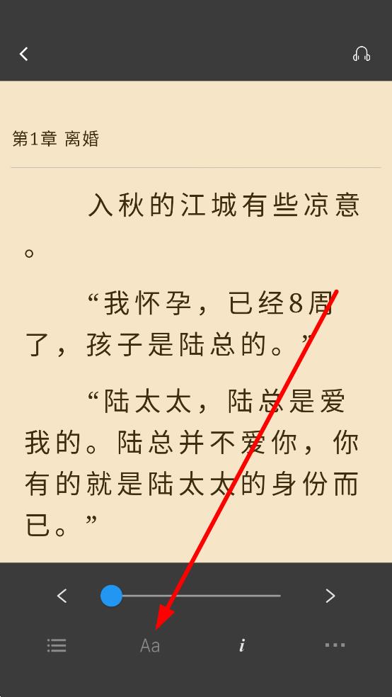 1、在小說(shuō)閱讀界面,輕觸屏幕喚起底部功能欄,點(diǎn)擊Aa圖標(biāo),進(jìn)入閱讀設(shè)置界面。